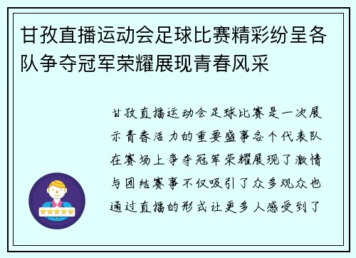 甘孜直播运动会足球比赛精彩纷呈各队争夺冠军荣耀展现青春风采